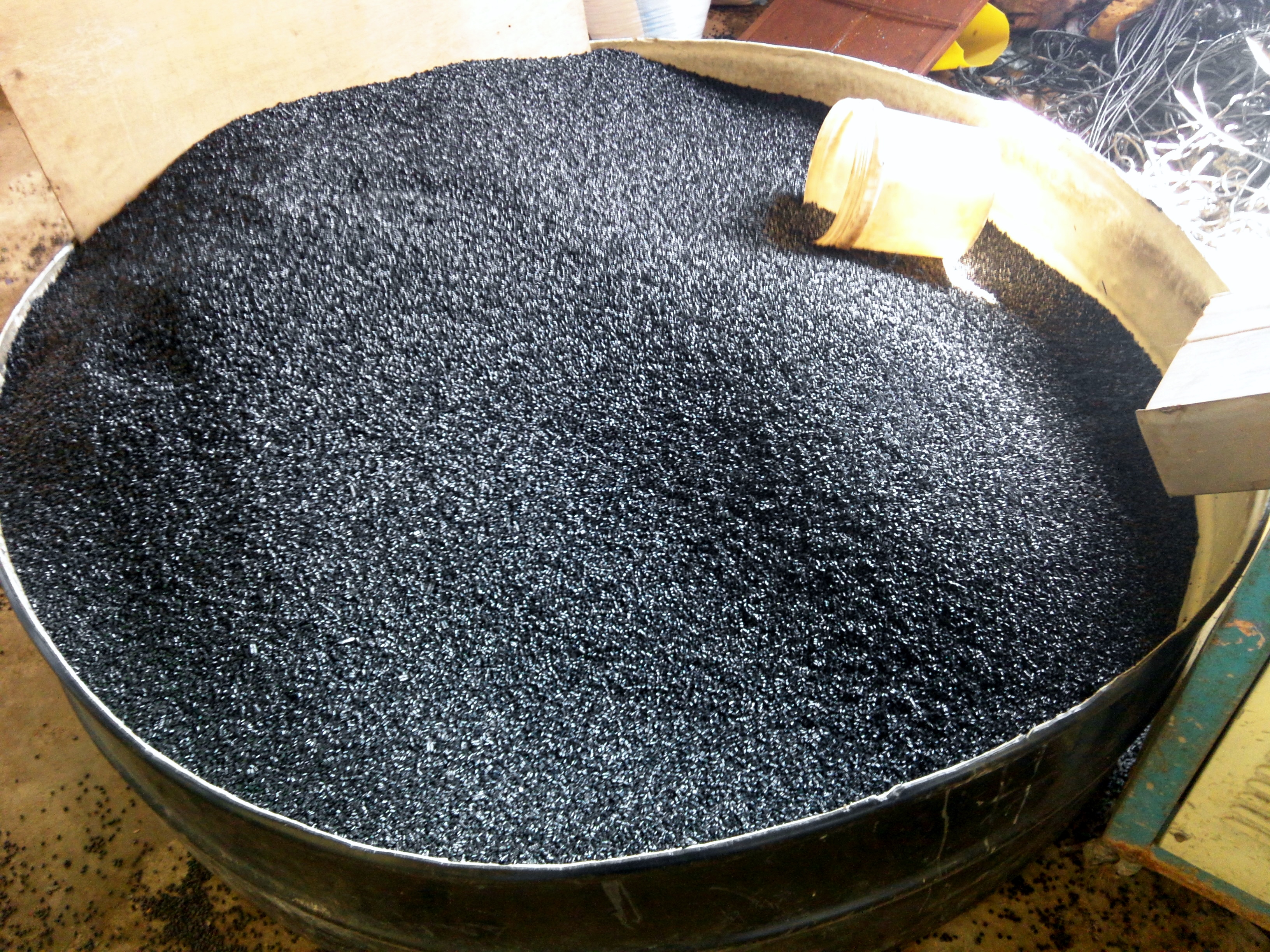 One of the more advanced industrial setups we have come across is located on Abosey Okai Road. Stages in the process flow include sorting, shredding and pelletizing. This micro-factory engages more then 20 youths in Agbogbloshie in full-time employment! The sorted plastics are ground using a milling machine (see picture below) which is connected to a water bath. Shredded plastics are then collected and dried. Finally, the shredded high-density polyethylene (HDPE) are pelletized using an extrusion machine. These pellets — made out of plastic waste from all over Accra — are then sold as feedstock to formal industries both in Ghana and globally that have the capability to produce plastics films.