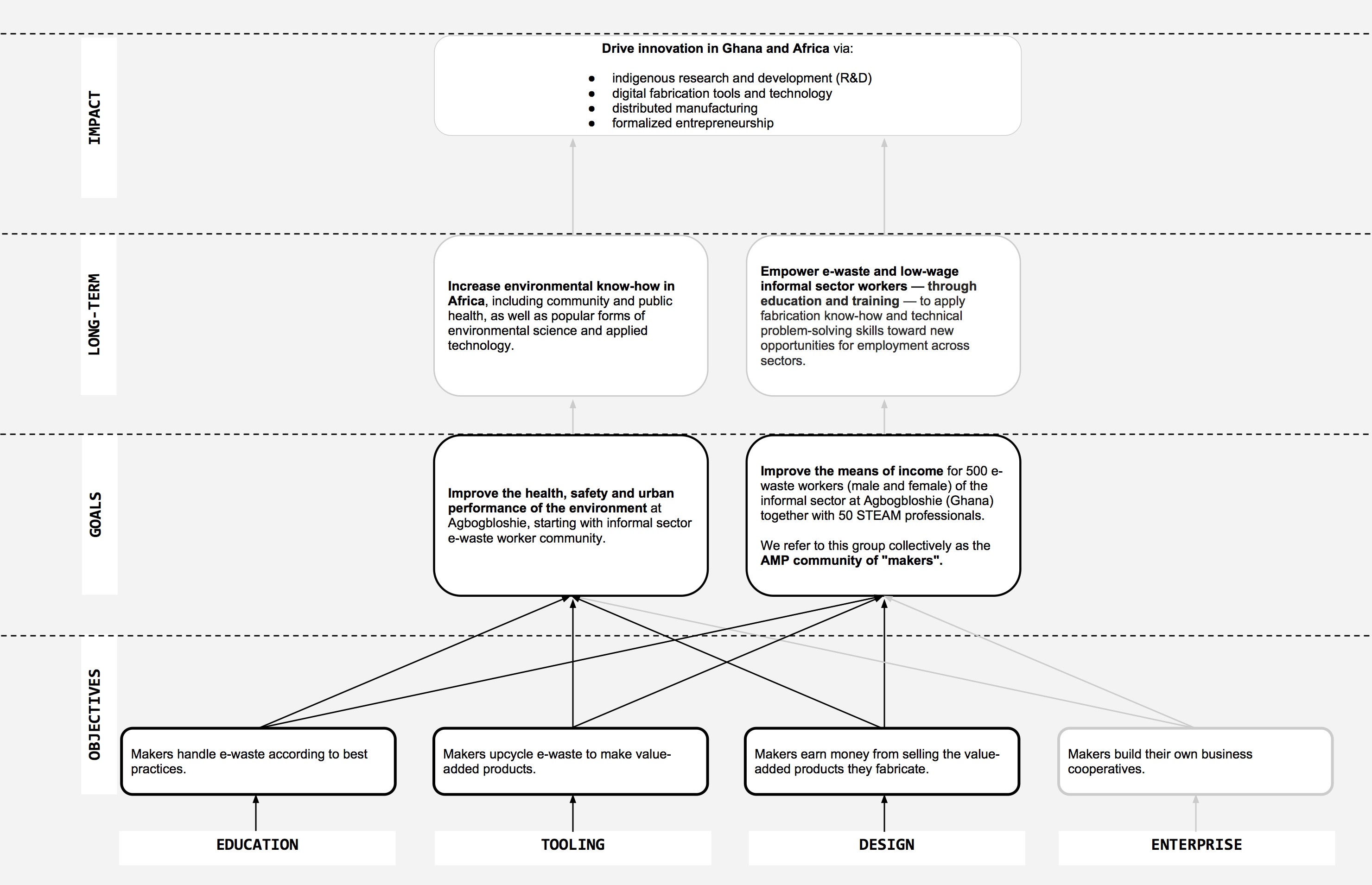Whereas others reductively denigrate Agbogbloshie as a toxic e-waste dump, we see instead an urban-scale open-air manufactory—an action-oriented maker ecosystem where materials and components reclaimed from end-of-life equipment feature as inputs for making new products (see “Made in Agbogbloshie”). The environmental challenges are huge, but Agbogbloshie is an amazing model—a distributed network of makers recycling the city at the grassroots. AMP aims to learn from Agbogbloshie, in order to amplify its potential as a model of micro-industrial ecosystems for broader application.