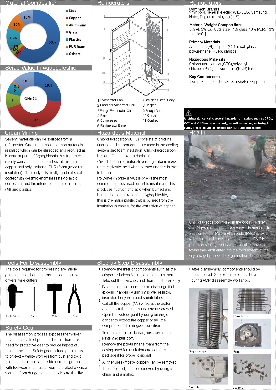 The manual is organized so as to give information on material composition, parts and components, hazardous materials, urban mining opportunities, tools for dis-assembly, steps for dis-assembly, safety gear, and opportunities and ideas for remaking.