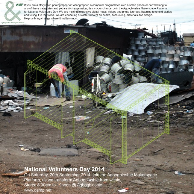 The stories we tell of ourselves affect our lives. At AMP, it has been our intention right from the onset to tell the untold stories of Agbogbloshie and its environs. Through mapping, interviews, photography and videos, we have sought to understand this vast and intense landscape, often denigrated by popular media reportage. By these tools, we intend to encourage and improve best practises, gradually eliminate the not so good and to transform the entire Agbogbloshie into a vibrant industrial hub. This year, as we commemorate founders day ( also National Volunteers Day) be part of this, process of transformation. If you are a storyteller, photographer or videographer, a computer programmer, own a smart phone or don’t belong to any of these categories and yet are a change-maker, this is your chance. Join the Agbogbloshie Makerspace Platform for National Volunteers Day. We are making interactive digital maps, videos and photo-journals, listening to untold stories and telling it to the world. We are educating e-waste workers on health, accounting, materials and design.