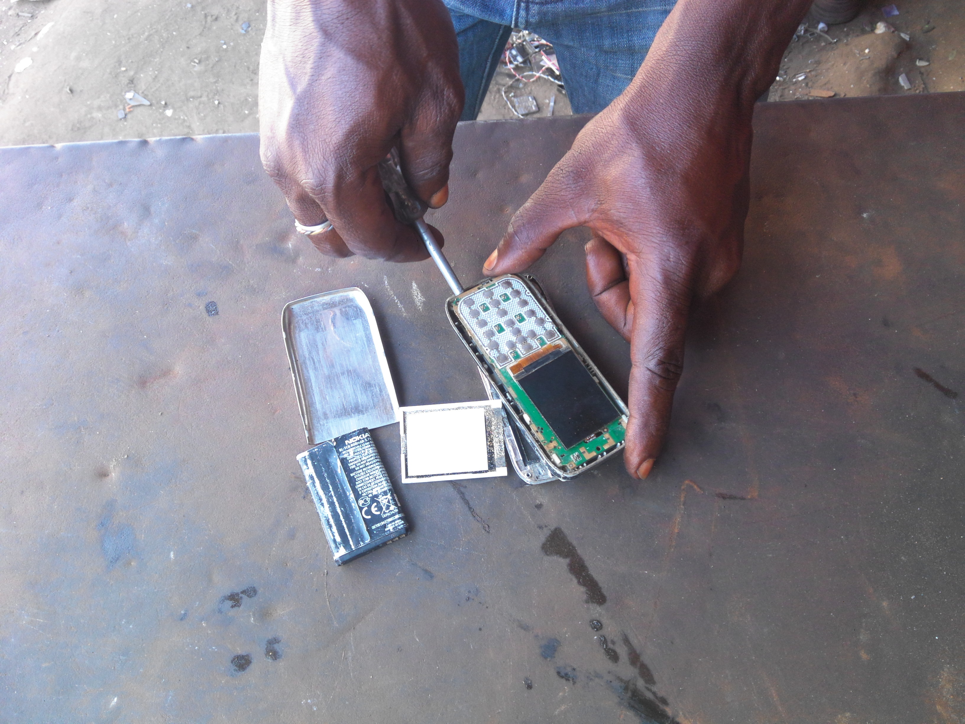 Dis-assembly of mobile phone by an e-waste worker in Agbogbloshie