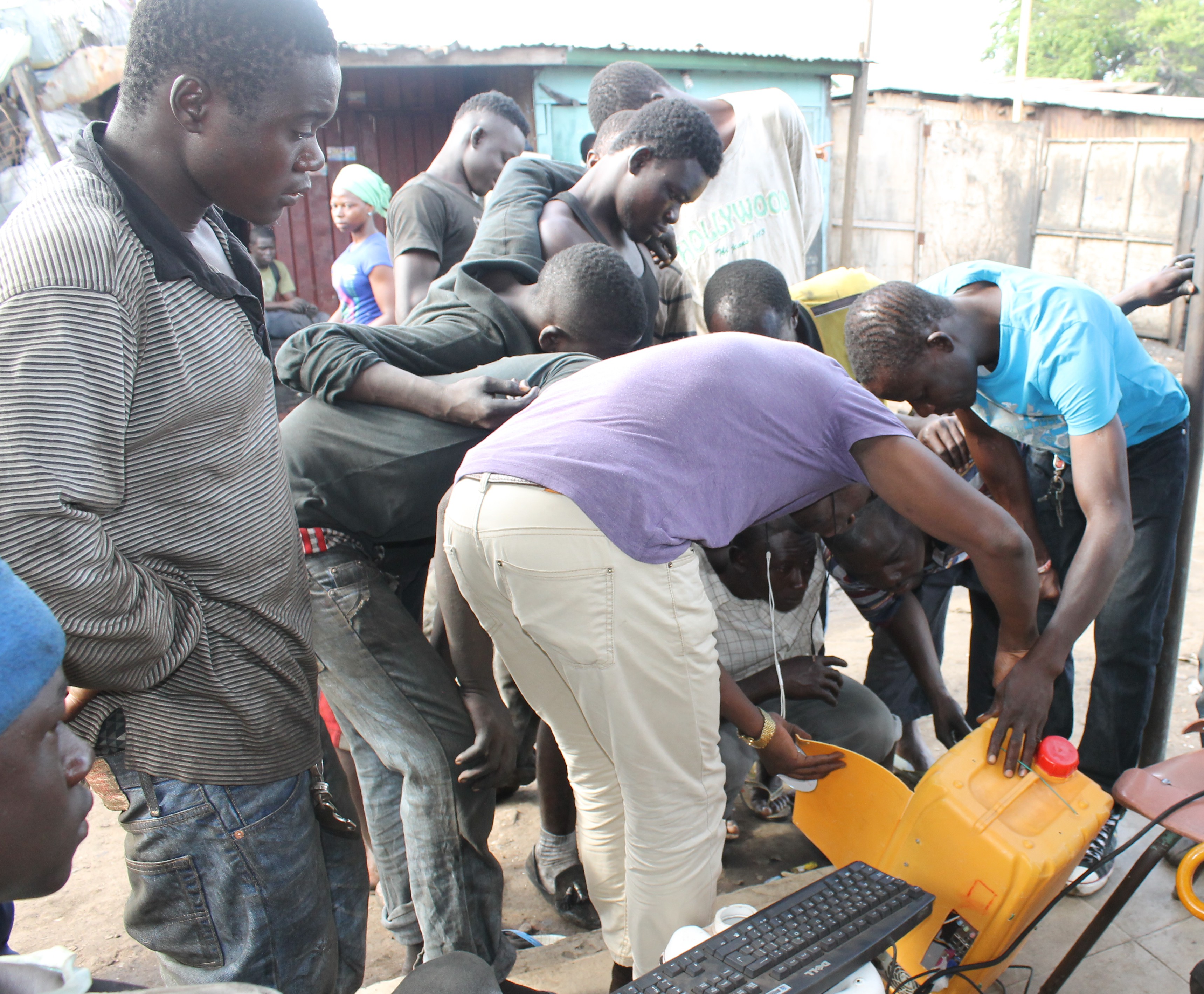 Upon arrival, the team pitched tent and Daniel (AMP intern from creativity group KNUST) briefly introduced the Jerry concept to the community. After we explained the concept to Emeka, a monitor, keyboard and mouse, were made available for us to use. He also gave us a compact disc (CD) with an operating system. The team installed it and allowed the participants to familiarize themselves with the Jerry whilst interactively exchanging ideas with the AMP makers collective.