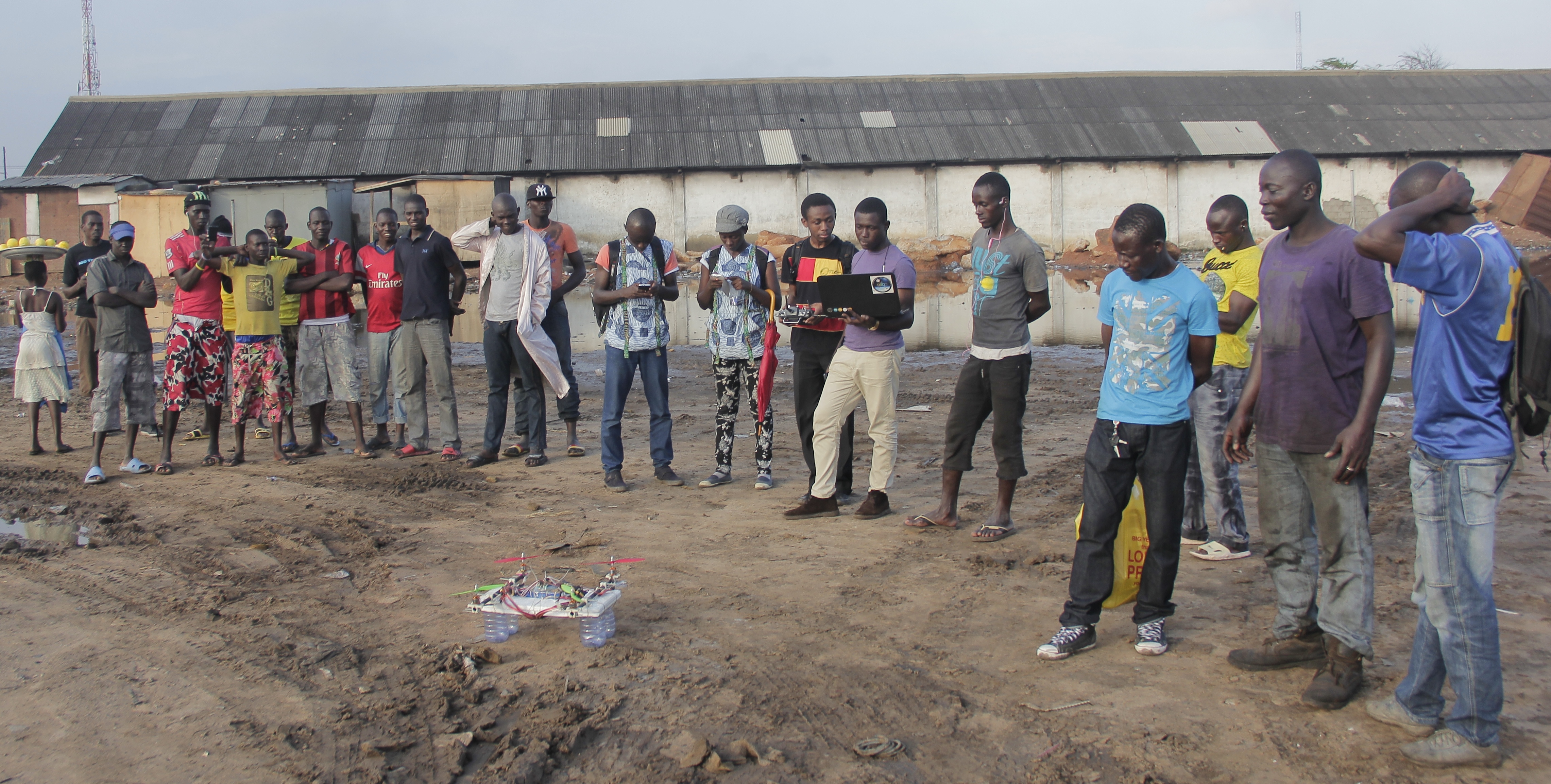 The team later presented the concept of the Quadcoper to the workers by Samuel Amoako (AMP intern and student from KNUST). It was then flown on the football field to demonstrate how it will help AMP map Agbogbloshie and also monitor air pollution levels.