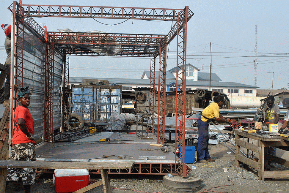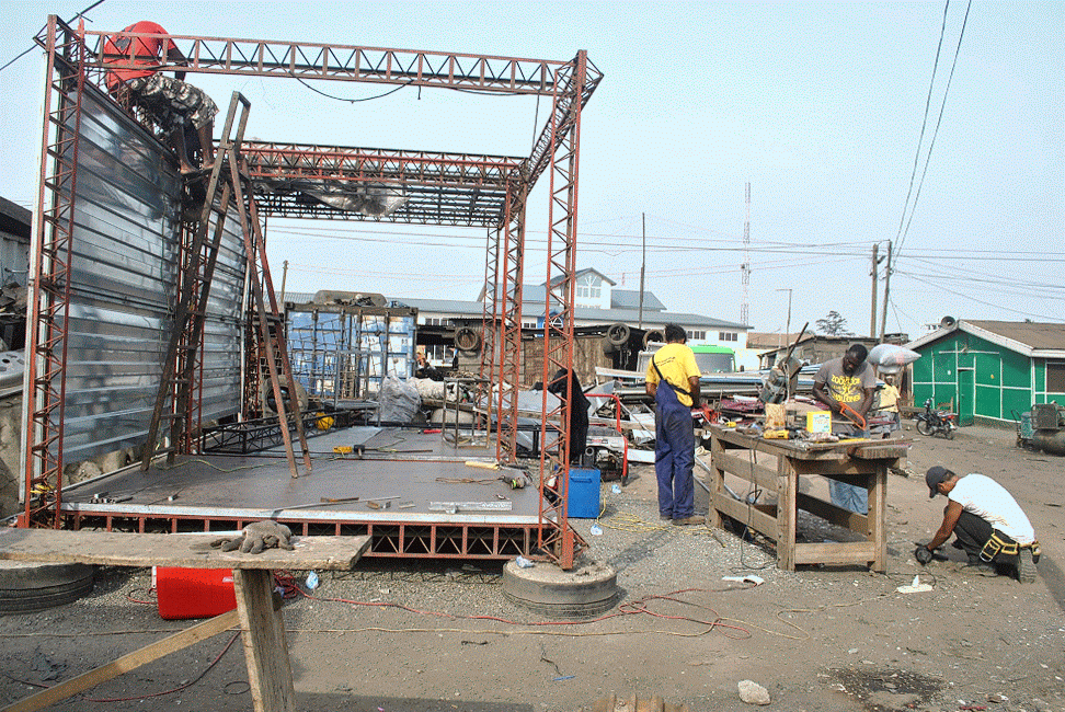 Building on our experiments with plastic during AMPQAMP and drawing on the knowledge and expertise of oven fabricators based on the ground in Agbogbloshie, we are now co-designing and prototyping a mini-kiln. This week, William Mensah completed fabrication of the first prototype in Accra Timber Market,adjacent to Agbogbloshie. The mini-kiln fits the standard module of the AMP spacecraft and is one of the first tools from the AMP tool-set developed to plug into the community workshop.